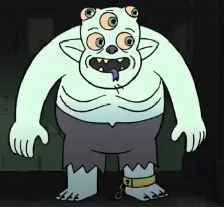 Jest on sporych gabarytów demonem o szpiczastych uszach, ma odznaczający się kolorem szary nos oraz dwa włosy na brodzie. Jego skóra jest miętowo zielona, oraz nosi szare spodnie. Jego dłonie mają po 5 palców, a stopy po 4. U lewej stopy ma łańcuch.Poza tym ma pięć gałek ocznych, co jest jego najbardziej charakterystyczną cechą.